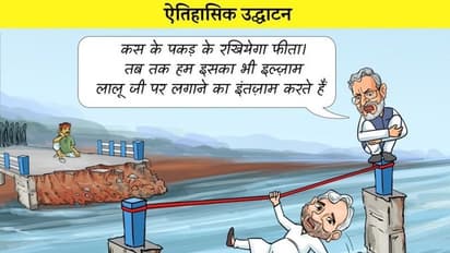 लालू ने ट्विटर पर एक तस्वीर पोस्ट की है, जिसमें नीतीश कुमार एक सड़क का उद्घाटन करने जा रहे हैं और पानी के दबाव के चलते सड़क बह जाती है। नीतीश के हाथ में कैंची है और वे फीता को पकड़कर लटके हैं। उनका चश्मा नदी में गिर गया है। कार्टून में यह दिखाया गया है कि दूसरे छोर पर सुशील मोदी पिलर पर बैठे हैं।