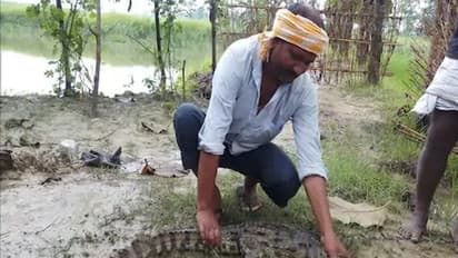 बगहा (bihar ) । बिहार में बाढ़ के पानी में बहकर मगरमच्छ रिहायशी क्षेत्रों में आने लगे हैं। आज फिर एक मगरमच्छ गांव तक पहुंच गया। कहा जा रहा है कि बगहा में पिपरा गांव के एक तालाब से मगरमच्छ में चला गया। जहां मछलियों का शिकार करने लगा। हालांकि सूचना पर पर्यावरण प्रेमी गजेंद्र यादव ने लोगों की मदद से पकड़ लिया। बता दें कि गजेन्द्र यादव को पर्यावरण के क्षेत्र में प्रदेश ही नहीं राष्ट्रीय स्तर पर भी कई सम्मान मिल चुका है।