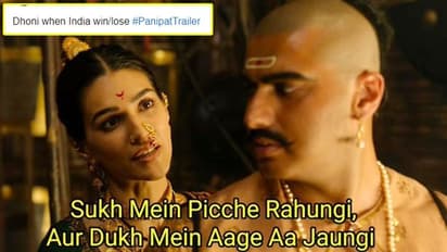 दरअसल, सोशल मीडिया यूजर्स अर्जुन कपूर और कृति सेनन के उस सीन को लेकर कमेंट्स कर रहे हैं जब ट्रेलर में अर्जुन यूद्ध लड़ने जाते हैं। तब कृति उनसे कहती हैं, 'सुख में पीछे रहूंगी और दुख में आगे आ जाऊंगी।' इस पर लोग मीम्स बना रहे हैं। एक यूजर ने इस सीन को शेयर करते हुए लिखा, 'धोनी ऐसा ही कहते हैं जब इंडिया जीतती और हारती है।' दूसरे ने लिखा, 'मिडिल क्लास के लोगों के साथ ईएमआई इंस्टॉलमेंट के समय ऐसा होता है।' वहीं, एक ने तो इस सीन को दिल्ली की धूंध से जोड़ दिया। ऐसे ही ट्विटर पर तमाम तरह से यूजर्स मीम्स बनाकर कमेंट्स कर रहे हैं।