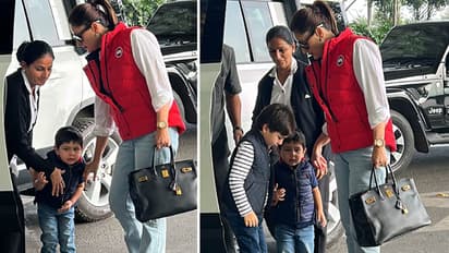 मुंबई एयरपोर्ट पर करीना कपूर के दोनों बेटे तैमूर अली खान और जेह अली खान एक-दूसरे का साथ थामे डैशिंग लुक में नजर आए।