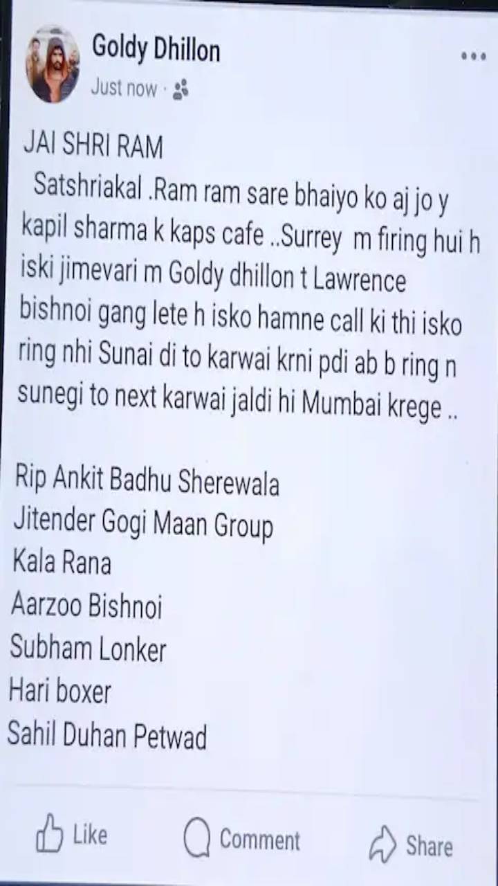 सोशल मीडिया पर एक पोस्ट तेजी से वायरल हो रहा है। इसमें लिखा है, “जय श्री राम, सत श्री अकाल. राम राम सभी भाइयों को, आज जो कपिल शर्मा के ‘कैप्स कैफे (Kaps Cafe), सुरे (Surrey) में फायरिंग हुई है. उसकी ज़िम्मेदारी गोल्डी ढिल्लों और लॉरेंस बिश्नोई गैंग ( lawrence bishnoi gang ) लेते हैं। हमने इसको (कपिल शर्मा) को कॉल की थी, इसको रिंग नहीं सुनाई दी तो कार्रवाई करनी पड़ी।इस पोस्ट में आगे लिखा है, “अब भी कॉल नहीं उठाएगा तो अगली कार्रवाई मुंबई में करेंगे. RIP (श्रद्धांजलि)- अंकित बधु शेरेवाला, जितेंदर गोगी मान ग्रुप, काला राणा, आरज़ू बिश्नोई, शुभम लोंकर, हरी बॉक्सर और साहिल दुहन पेटवाड़।