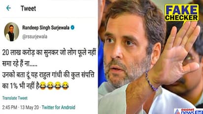 कांग्रेस के नेता रणदीप दीप सिंह सुरजेवाला के ट्वीट का एक स्क्रीनशॉट सोशल मीडिया में खूब वायरल है। स्क्रीनशॉट में दिख रहे ट्वीट के मुताबिक- “20 लाख करोड़ का सुनकर जो लोग फूले नहीं समा रहे हैं ना….उनको बात दूं यह राहुल गांधी की कुल संपत्ति का 1% भी नहीं है” 24 मई 2020 को ‘हिन्दू अनुराग ठाकुर’ नामक यूज़र ने ये तस्वीर फ़ेसबुक ग्रुप ‘PMO INDiA’ में शेयर की। ठाकुर ने तस्वीर को शेयर करते हुए लिखा, “सुर्जेवाला जी बहुत-बहुत धन्यवाद गाँधी परीवार की असलियत सामने लाने के लिए😁😁”