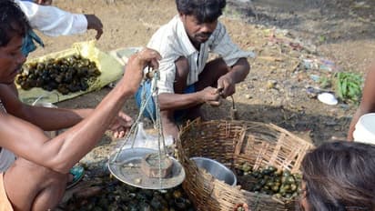 गरीब महिलाएं बाढ़ के पानी से घोंघा छानकर लाती हैं और उसका मीट निकालकर बेच रही हैं।