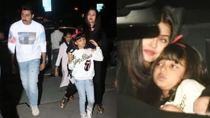 बेटी आराध्या का हाथ थामे ऐश्वर्या राय, साथ में पति अभिषेक बच्चन।