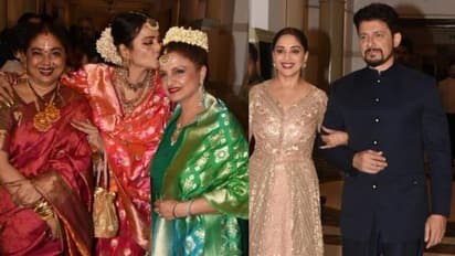 वहीं, माधुरी दीक्षित पति श्रीराम नेने के हाथों मं हाथ डाले रिसेप्शन में नजर आईं। उस मौके पर माधुरी ने क्रीम गोल्डन कलर का गाउन कैरी किया। सिम्पल मेकअप में भी माधुरी बेहद खूबसूरत नजर आ रही थी।