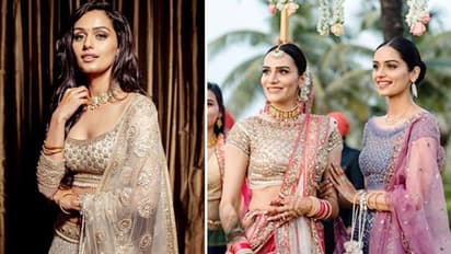 इसमें उन्होंने गोल्डन व्हाइट मिक्स्ड लहंगे चोली के साथ न्यूड मेकअप किया है और हल्का नेकलेस कैरी किया है। वहीं, उनकी बहन भी मानुषी से मौचिंग लहंगे चोली में नजर आ रही हैं। इसके साथ ही एक्ट्रेस की बहन दुल्हन के जोड़े में भी दिखाई दे रही हैं।