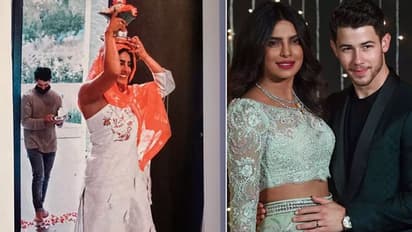 गृह प्रवेश वाली इस तस्वीर में जहां प्रियंका सिंगल स्लीव्स कुर्ते और सिर पर दुपट्टा, माथे पर कलश लिए नजर आ रही हैं। उनके पीछे निक नजर आ रहे है और उनके हाथ में थाली है।