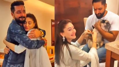 हिंदुस्तानी भाऊ को राखी बांधने के बाद उनके गले लगतीं शेफाली जरीवाला। दूसरी तस्वीर में अपने पेट डॉग को राखी बांधती शेफाली। पास ही दिख रहे उनके पति पराग त्यागी।