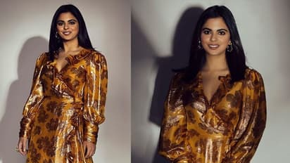 ईशा अंबानी ने इस फोटोशूट के लिए हाउस ऑफ कनटेंप्ररी से फैशन डिजाइनर मानिक्यू ल्यूइलियर (Monique Lhuillier) का एक खुबसूरत सा गोल्डन गाउन पहना था। ईशा अपने इस मैटालिक फ्लोरल लुक गाउन में बेहद खूबसूरत लग रही थीं।
