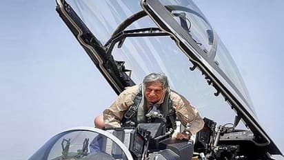 युद्धक विमान उड़ाने के लिए कॉकपिट में बैठते रतन टाटा। विमान उड़ाने के पहले वे एक सहयोगी पायलट से कुछ चर्चा कर रहे हैं।