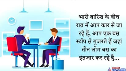 सवाल: भारी बारिश के बीच रात में आप कार से जा रहे हैं, आप एक बस स्टॉप से गुजरते हैं जहां तीन लोग बस का इंतजार कर रहे हैं: एक बूढ़ी औरत है जिसे तुरंत मदद चाहिए, एक पुराना दोस्त जिसने कभी आपकी जान बचाई थी और एक लड़की जो आपके सपनो की साथी हो सकती है, कार में आप दो लोगों को बैठा सकते हैं इस परिस्थिति में आप क्या करेंगे ?