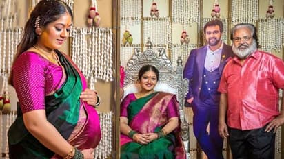 मेघना राज ने बेबी शॉवर के दौरान हरे रंग की पिंक बॉर्डर वाली साड़ी पहनी थी। स्टेज पर बैठी मेघना के साथ उनके परिवार के लोग नजर आए।