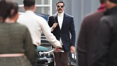 सामने आई फोटोज में अक्षय कुमार का अलग ही लुक देखने को मिल रहा है। हाई नेट टी-शर्ट, काला चश्मा और मूंछों में वे नजर आ रहे हैं।