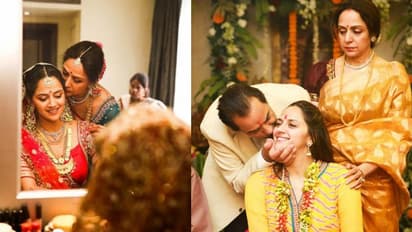 बेटी अहाना को विदा करने के दौरान हेमा मालिनी और धर्मेंद्र। बहन अहाना को गले लगाती ईशा देओल।