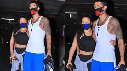 ब्वॉयफ्रेंड के साथ मास्क लगाए पोज देती जैकी श्रॉफ की बेटी कृष्णा। दोनों देर रात मुंबई लौटे हैं।