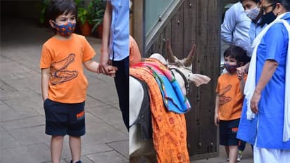 तैमूर जैसे ही घर से बाहर निकले उन्हें गाय नजर आई। पहले तो तैमूर काफी देर तक गाय को दूर से देखते रहे फिर उन्होंने गाय को चारा खिलाया और गौ सेवा भी की।