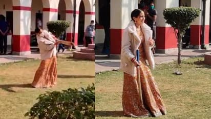 सारा ने लाला-सुनहरी रंग का लहंगा पहन रखा है और चेहरे पर मास्क लगाए हाथ में बल्ला लिए गेंद को मारती नजर आ रही है।