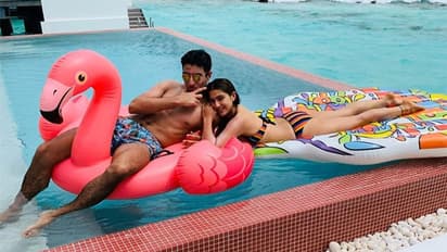 सारा अली खान भाई इब्राहिम के साथ वाटर स्कूटर चलाते हुए।