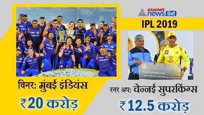 आईपीएल 2019 का फाइनल मुंबई इंडियंस और चेन्नई सुपरकिंग्स के बीच खेला गया था, जिसमें मुंबई इंडियंस ने जीत दर्ज की थी। आईपीएल 2019 जीतने वाली टीम मुंबई इंडियंस को 20 करोड़ की राशि दी गई थी, जबकि उपविजता चेन्नई सुपरकिंग्स को 12.50 करोड़ की राशि मिली थी।