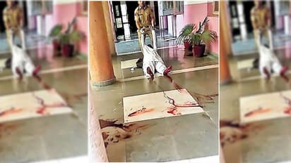 खून से लथपथ शख्स को घसीटते हुए बाहर ले जाने की यह तस्वीर हरियाणा के रोहतक में एसपी आफिस की है। यह आदमी एसपी से मिलने आया था। जब नहीं मिलने दिया गया, तो उसने अपने पैरों की नसें काट लीं।