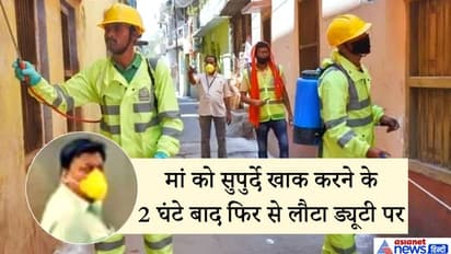 यह तस्वीर भोपाल के नगर निगम के सैनिटाइजेशन अभियान की जिम्मेदारी संभाल रहे अशरफ अली की है। बुधवार को इनकी 67 वर्षीय मां नूरजहां का निधन हो गया था। अली अपनी मां को सुपुर्दे खाक करने के 2 घंटे बाद ही ड्यूटी पर लौट आए। अली जलकार्य विभाग के कर्मचारी है, लेकिन पिछले कुछ सालों से सीवेज वाहनों के प्रभारी है। बहरहाल, जब इसकी जानकारी निगम आयुक्त बी विजय दत्ता को पता चली, तो उन्होंने अली को घर जाने को कहा। लेकिन अली ने जवाब दिया कि यह उससे बड़ी जिम्मेदारी है।