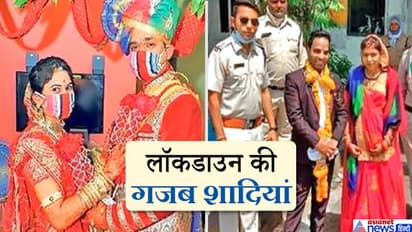 पहली तस्वीर रतलाम की है। यह कपल है चार्टर्ड नरेंद्र पिरताणी और आरती। नरेंद्र अपनी दुल्हन के लिए गहने खरीदने लुनकरण (राजस्थान) से 18 मार्च को रतलाम आए थे। इसी दौरान लॉकडाउन हो गया। लिहाजा, उन्हें अपने परिवार की गैरमौजूदगी में ससुराल में ही एक कमरे में 7 फेरे लेने पड़े। इस शादी में दूल्हे के माता-पिता वीडियो कॉलिंग के जरिये शामिल हुए। दूसरी तस्वीर में उज्जैन के महालक्ष्मीनगर निवासी दीपक जाट हैं। वे अक्षया तृतीया पर बाइक से इंदौर पहुंचे। वहां शादी करके बाइक पर बैठाकर ही दुल्हन को घर ले आए। शादी में पंडितजी मौजूद नहीं थे। उन्होंने वीडिया कॉलिंग के जरिये मंत्रोच्चार किया। लौटते वक्त निनौरा नाके पर दूल्हा-दुल्हन को पुलिस ने रोका। हालांकि, पूरी बात सुनने के बाद पुलिस ने दूल्हा-दुल्हन के साथ फोटो खिंचवाया और बधाई दी।