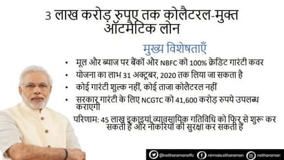 MSME सेक्टर के लिए बड़े ऐलान: वित्त मंत्री निर्मला सीतारमण ने बताया, हम गरीबों, जरूरतमंदों, प्रवासियों, दिव्यांगों और वृद्धों के प्रति अपनी जिम्मेदारी को नहीं भूलेंगे। उन्होंने कहा, मध्यम सूक्ष्म, लघु और कुटीर, गृह उद्योग में करीब 12 करोड़ लोगों को रोजगार मिलता है। इसमें MSME सेक्टर को 3 लाख करोड़ का कोलैट्रल फ्री लोन दिया जाएगा।