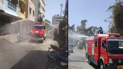 महाराष्ट्र के पुणे में फायर बिग्रेड की गाड़ियों ने सड़कों को सैनिटाइज किया।