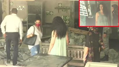 टूटे ऑफिस को देखकर गेट से बाहर आती कंगना की बहन रंगोली।