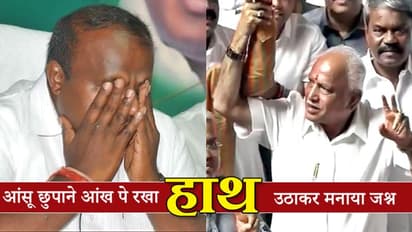 बेंगलुरू। कर्नाटक विधानसभा में विश्वास मत पर चार दिन से चले आ रहे घमासान के बाद मंगलवार शाम कुमारस्वामी सरकार फ्लोर टेस्ट (विश्वास मत) में फेल हो गई। फ्लोर टेस्ट में कांग्रेस-जेडीएस गठबंधन को 99 वोट मिले, जबकि भाजपा के पक्ष में बहुमत के लिए जरूरी 105 वोट डाले गए। बता दें कि स्वामी ने 14 महीने तक कांग्रेस के साथ गठबंधन सरकार चलाई। उन्हें 116 विधायकों का समर्थन था। हालांकि, 1 जुलाई को कांग्रेस के दो विधायकों के इस्तीफे के बाद पिछले 23 दिन से कर्नाटक में सियासी ड्रामा चल रहा था। सरकार गिरने के बाद जहां कुमारस्वामी आंसू छुपाने के लिए आंख पर हाथ रखे नजर आए तो वहीं बीजेपी के येदियुरप्पा जश्न मनाने से खुद को रोक नहीं सके। दूसरी ओर, कांग्रेस-जेडीएस गठबंधन के फ्लोर टेस्ट में फेल होने के बाद सोशल मीडिया पर यूजर जमकर मजाक उड़ा रहे हैं।