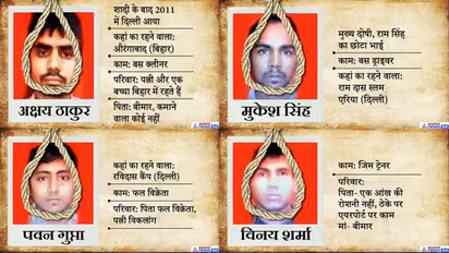 निर्भया के चारों दोषी : 1)मुकेश सिंह - निर्भया से गैंगरेप का दोषी मुकेश बस क्लीनर का काम करता था। जिस रात गैंगरेप की यह घटना हुई थी उस वक्त मुकेश सिंह बस में ही सवार था। गैंगरेप के बाद मुकेश ने निर्भया और उसके दोस्त को बुरी तरह पीटा था। 2)अक्षय ठाकुर- यह बिहार का रहने वाला है। इसने अपनी पढ़ाई बीच में ही छोड़ दी और दिल्ली चला आया। शादी के बाद ही 2011 में दिल्ली आया था। यहां वह राम सिंह से मिला। घर पर इस पत्नी और एक बच्चा है। 3)विनय शर्मा- निर्भया का दोषी विनय जिम ट्रेनर का काम करता था। वारदात वाली रात विनय बस चला रहा था। इसने पिछले साल जेल के अंदर आत्महत्या की कोशिश की थी लेकिन बच गया। 4)पवन गुप्ता- पवन दिल्ली में फल बेंचने का काम करता था। वारदात वाली रात वह बस में मौजूद था। पवन जेल में रहकर ग्रेजुएशन की पढ़ाई कर रहा है।