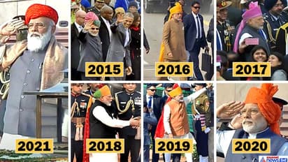 2018: प्रधानमंत्री नरेंद्र मोदी पहनावे को लेकर अक्सर चर्चा में रहते हैं। पीएम मोदी के बारे में कहा जाता है कि वह जहां कहीं भी जाते है वहां के संस्कृति को समझने की कोशिश करते हैं। इसी क्रम में 2018 में गणतंत्र दिवस के मौके पर केसरिया, हरे और लाल रंग का मिक्स साफा बांधे हुए नजर आएं। गौरतलब है की पीएम मोदी हर बार स्वतंत्रता दिवस और गणतंत्र दिवस के मौके पर साफा बांधे हुए नजर आते हैं।