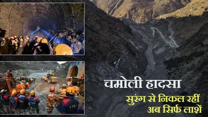 (ग्लेशियर टूटने की बाद की तस्वीर, इनसेट घटना के बाद नजर बनाए हुए रेस्क्यू टीम)