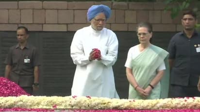 पूर्व प्रधानमंत्री मनमोहन सिंह राजीव गांधी को श्रद्धांजलि देते हुए।
