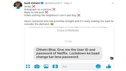 दरअसल, एक शख्स ने फेसबुक पर मैसेज कर भारतीय कप्तान से नेटफ्लिक्स का आईडी और पासवर्ड मांगा, जिसके बाद उन्होंने उस मैसेज का स्क्रीनशॉट ट्वीटर पर शेयर करते हुए कहा, ‘‘जर्सी नहीं, फोटो पर ऑटोग्राफ नहीं, पोस्ट पर रिप्लाई नहीं, पड़ोसी के बेटे के कुत्ते को विश करते हुए वीडियो भी नहीं। ये शख्स ऐसा है, जिसकी प्राथमिकता बिल्कुल साफ है और उसको देखते हुए मैं इस मांग पर विचार करने पर मजबूर हूं।’’