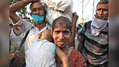 यह तस्वीर पश्चिम बंगाल के हावड़ा की है। यह एक मजदूर महिला है। जब उसे राशन नहीं मिल सका, तो वो रोने लगी। उसकी गोद में मासूम बच्चा था।