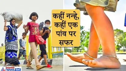 पहली तस्वीर फरिदाबाद की है। एक पैर से विकलांग यह बच्ची अपने परिवार के साथ पैदल घर को जा रही है। दूसरी तस्वीर 10 साल की एक बच्ची की है। जो नंगे पांव चंडीगढ़ के पास से यूपी के उन्नाव के लिए जाते दिखाई दी।