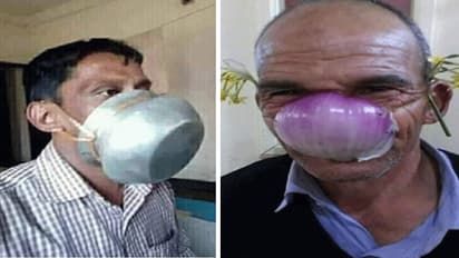 इंटरनेट पर यह दोनों तस्वीरें वायरल हो रही हैं। जिसमें एक युवक अपने चहरे पर एक गंजी (भगोना) लगाए हुए है। तो वहीं दूसरे युवक ने अपने मुंह पर एक प्याज का मास्क बनाकर लगाया है।