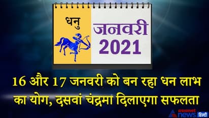 इस महीने सूर्य-बुध धनु राशि का लग्न में, गुरु-शनि मकर राशि का दूसरे भाव में, मंगल मेष राशि का पांचवे भाव में, राहु वृषभ राशि का छठे भाव में, चंद्रमा कर्क राशि का आठवें भाव में, केतु शुक्र वृश्चिक राशि का बारहवें भाग में रहेगा। इस महीने की शुरुआत आपके लिए ठीक नहीं रहेगी। किसी से वाद-विवाद की स्थिति बन सकती है। जिम्मेदारियां पहले से अधिक होंगी। 5 जनवरी के बाद दसवां चंद्रमा आपको सफलता दिलाएगा। इस समय आय के साथ-साथ मान-सम्मान भी बढ़ेगा। 8 से 15 जनवरी के बीच व्यापार को लेकर यात्रा हो सकती है। इस समय वाहन ध्यान से चलाएं, क्योंकि दुर्घटना के योग बन रहे हैं। पुराना रोग फिर से परेशान कर सकता है। इस समय मित्र आपकी हर संभव सहायता करेंगे। 16 और 17 जनवरी को धन लाभ के योग बन रहे हैं। विद्यार्थी के लिए समय शुभ फल देने वाला रहेगा। हर काम में सफलता मिलेगी। 23 जनवरी तक का समय आपके लिए बहुत ही अनुकूल रहेगा। महीने के अंतिम सप्ताह में ससुराल पक्ष से फायदा होगा। किसी प्रिय व्यक्ति से विवाद हो सकता है। इस समय आपको शांत रहना होगा, नहीं तो बात बिगड़ सकती है।