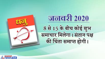 धनु राशिफल जनवरी 2020: इस महीने गुरु-शनि-बुध-सूर्य-केतु धनु राशि का लग्न में, शुक्र मकर राशि का दूसरे भाव में, चंद्रमा कुंभ राशि का तीसरे भाव में, राहु मिथुन राशि का सातवें भाव में, मंगल वृश्चिक राशि का बारहवें भाव में रहेगा। महीने की शुरूआत में आप अपने अधीनस्थों के सात तालमेल नहीं बैठा पाएंगे। आप स्वयं को बंधन में जकड़ा हुआ महसूस करेंगे। पैसों का नुकसान भी हो सकता है। कोई महंगी चीज गुम हो सकती है। काम में भी मन नहीं लगेगा। 8 से 15 के बीच कोई शुभ समाचार मिलेगा। संतान पक्ष की चिंता समाप्त होगी। इस बीच पति-पत्नी में किसी बात पर अन-बन हो सकती है। आपको अपने क्रोध पर नियंत्रण रखना होगा। आपके प्रेम-प्रसंग से जुड़े मामले सबके सामने आ सकते हैं। इस कारण परिवार में तनाव की स्थिति बनेगी। 18-19 को संपत्ति से जुड़े मामलों में उलझ सकते हैं। किसी से पैसा उधार लेना पड़ सकता है। अतिरिक्त प्रयास के बाद भी आप सफल नहीं हो पाएंगे। महीने का अंतिम सप्ताह थोड़ा राहत देने वाला रहेगा। इस सप्ताह कभी खुशी-कभी गम की स्थिति बनेगी।