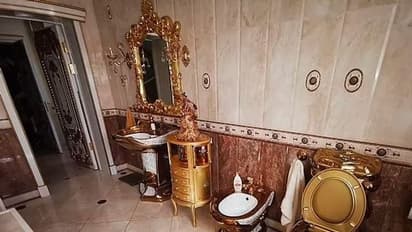 फोटो में दिख रहा है कि फर्श और दीवारों में संगमरमर लगाया गया है। बाथरूम को गोल्डन कलर से रंगा गया है। एक दूसरे बाथरूम में एक डबल-एंड बाथटब है, उसका सिंक और एक सोने का पेंट वाला शॉवर क्यूबिकल है। एक झूमर छत से लटका हुआ है।
