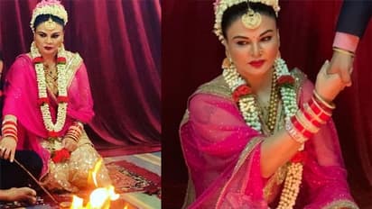 शादी की फोटोज में राखी पिंक-गोल्डन लहंगा, बालों में गजरा, मांग टीका और हाथों में भरी-भरी चूड़ियां पहने मुस्कराते नजर आ रही है। फोटोज में वे पति का हाथ थामे अग्नि के पास बैठी है हालांकि, उनके पति का चेहरा किसी भी फोटो में नजर नहीं आ रहा है।