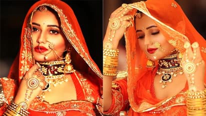 अपने लेटेस्ट फोटोशूट में रश्मि देसाई राजस्थानी दुल्हन बनी दिख रही हैं। इस दौरान उन्होंने ऑरेंज कलर की लहंगा चोली पहनी। अपने लुक को उन्होंने नेकलेस, झुमका, मांग टीका और नथ से कम्प्लीट किया। तस्वीरों में रश्मि बेहद खूबसूरत लग रही हैं।