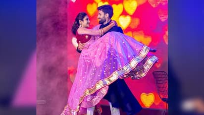 इन फोटोज में नुसरत जहां को उनके पति रिंग पहनाते हुए नजर आ रहे हैं। वहीं, एक्ट्रेस को निखिल गोद में भी उठाते हुए दिखे, जिसके बाद नुसरत शरमा जाती हैं। (फोटो सोर्स: इंस्टाग्राम)