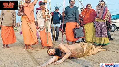 माघ मेले में कल्पवास करने आए मौनी बाबा अपने शिविर से संगम स्नान करने रोजाना लेट कर जाते हैं।