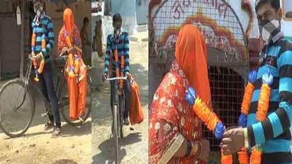 हमीरपुर (Uttar Pradesh) । कोरोना वायरस के संक्रमण की रोकथाम के लिए देशभर में लॉकडाउन किया गया है। यूपी के मुख्यमंत्री योगी आदित्यनाथ ने 30 जून तक किसी भी प्रकार के सार्वजनिक कार्यक्रम पर रोक लगा दिया है। ऐसे में पहले से तय शादियों को लोग टाल दे रहे हैं, लेकिन बहुत से ऐसे भी लोग हैं जो तय तिथि पर अनोखे तरीके से शादी कर रहे हैं, मगर अब तक की शादियों में सबसे अलग शादी महोबा में हुई है। जहां हमीरपुर से जिले से महोबा जिले तक का सफर साइकिल से तय कर दूल्हा एक दिन पहले ही ससुराल पहुंच गया। मास्क लगाकर शादी की और उसके बाद नियमों का पालन करते हुए साइकिल पर ही बैठाकर दुल्हन को लेकर 100 किलोमीटर दूर अपने घर पहुंच गया। जिसकी अब तस्वीरें सोशल मीडिया पर वायरल हो रहीं हैं।