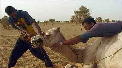 कुछ इस तरह से लोगों ने गुस्साए और हिंसक हो चुके ऊंट पर काबू पाया।