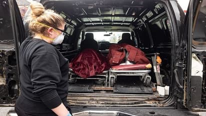 वैन में वैलवेट बैग में रख कर कोरोना से मौत के शिकार हुए दो लोगों को फ्यूनरल होम ले जाया जा रहा है। मरने वालों की संख्या इतनी ज्यादा है कि कॉफीन की कमी हो गई है।