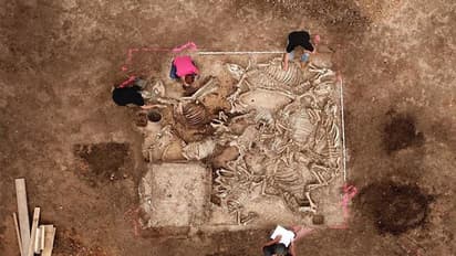 आसमान से कैद की गई राजा की मिली कब्र। राजा की बॉडी 6 महिलाओं से घिरी थी। इसके अलावा राजा की कब्र के पास घोड़े और कुत्ते सहित 11 जानवरों के अवशेष भी मिले।