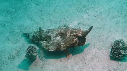 मिक्की के वीडियो में इस बैटफिश के सिर पर सींघ नजर आ रहा है। साथ ही ये अपने फिन्स को पैरों की तरह इस्तेमाल करती नजर आई। मिक्की ने बताया कि ऐसा नजारा जल्दी देखने को नहीं मिलता। ये अनोखा है।